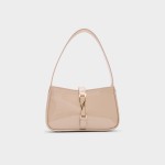 Glossy patent shines with a sculptural gold twist buckle, turning this sleek beige shoulder bag into a subtle mirror that catches city lights while the slim strap keeps movement easy. Tuck it against a satin slip for rooftop dates or sling it with wide-leg denim on coffee runs to polish every step.