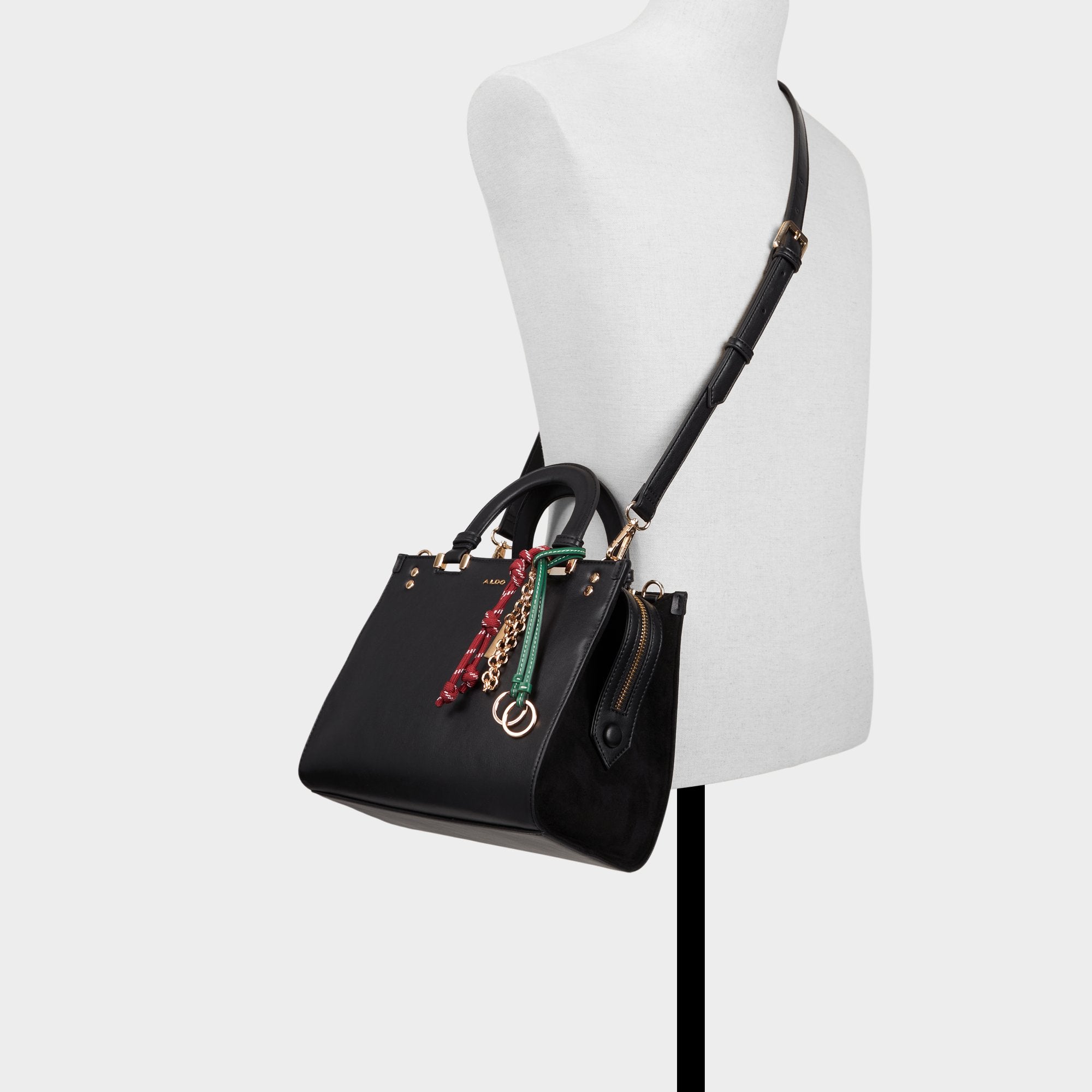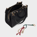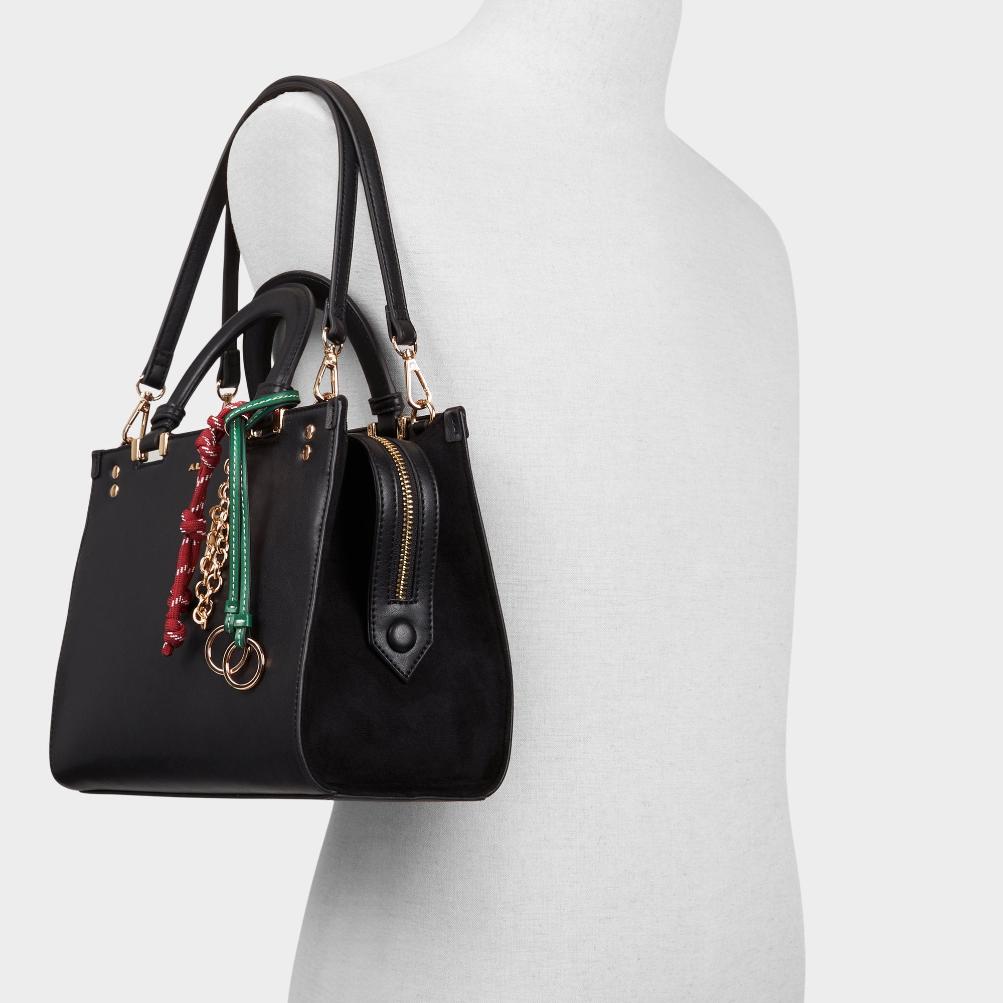 Sleek black leather frames a squared silhouette, with a knotted tassel-and-chain charm adding a bold focal point, while a convertible carry shifts from top-handle to cross-body with one easy snap. Carry it with tailored separates for coffee runs, or sling it over slip dresses on date nights, finishing looks with sleek