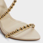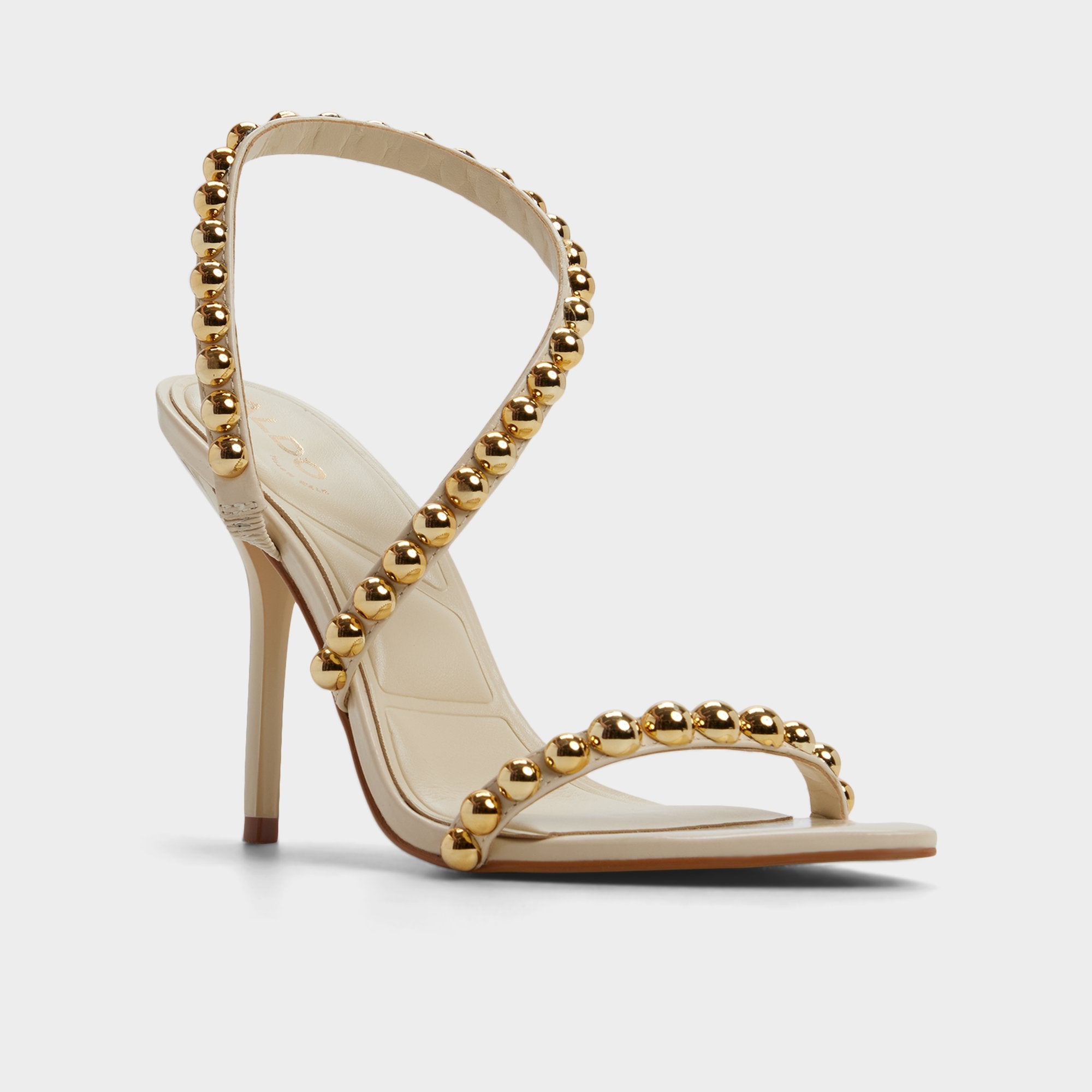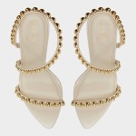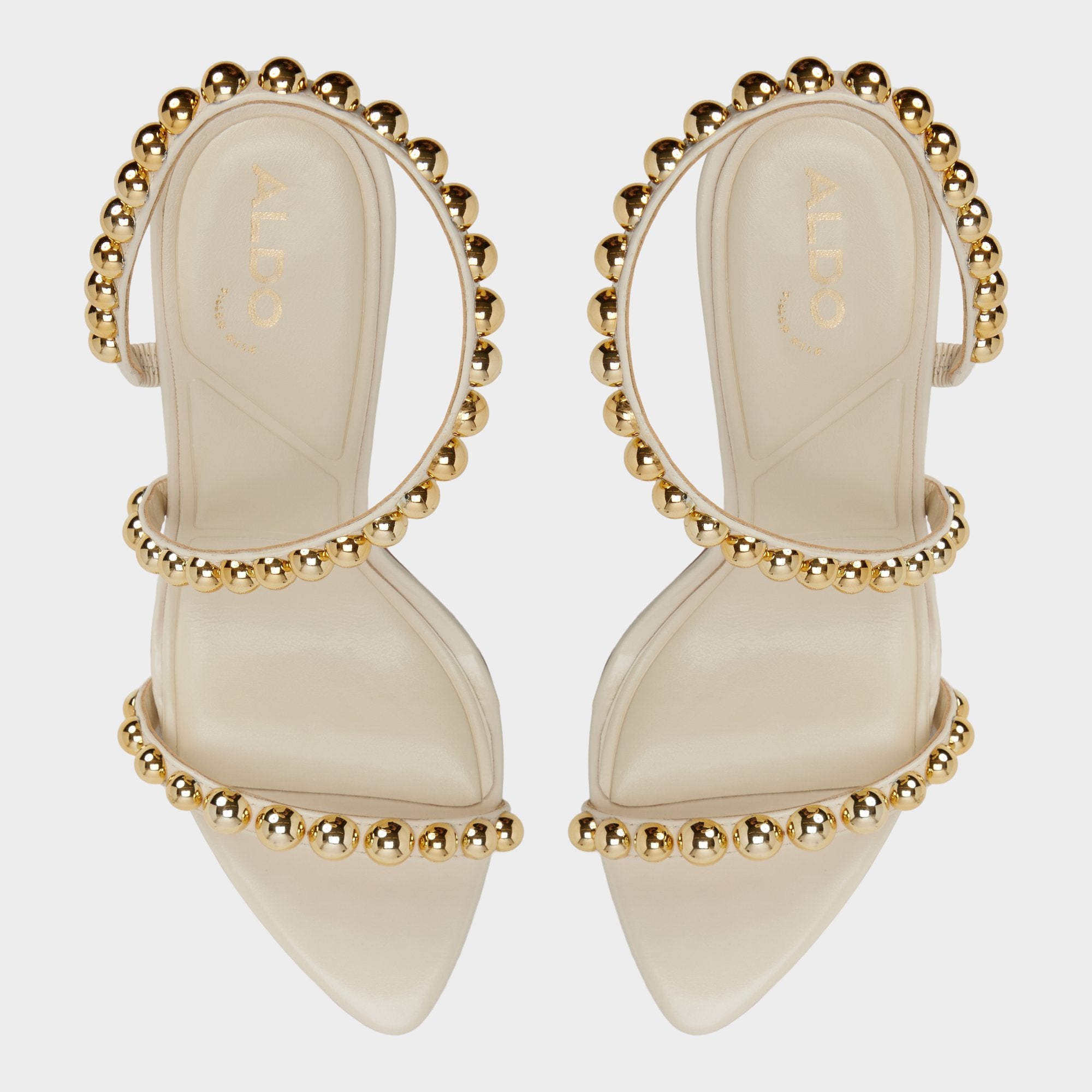 The Attey strappy stiletto is your go-to vacation companion in soft beige. An elegant almond toe pairs perfectly with shimmering gold beading that catches the light with every step. Supportive straps let you explore, celebrate, and look fabulous all day long.