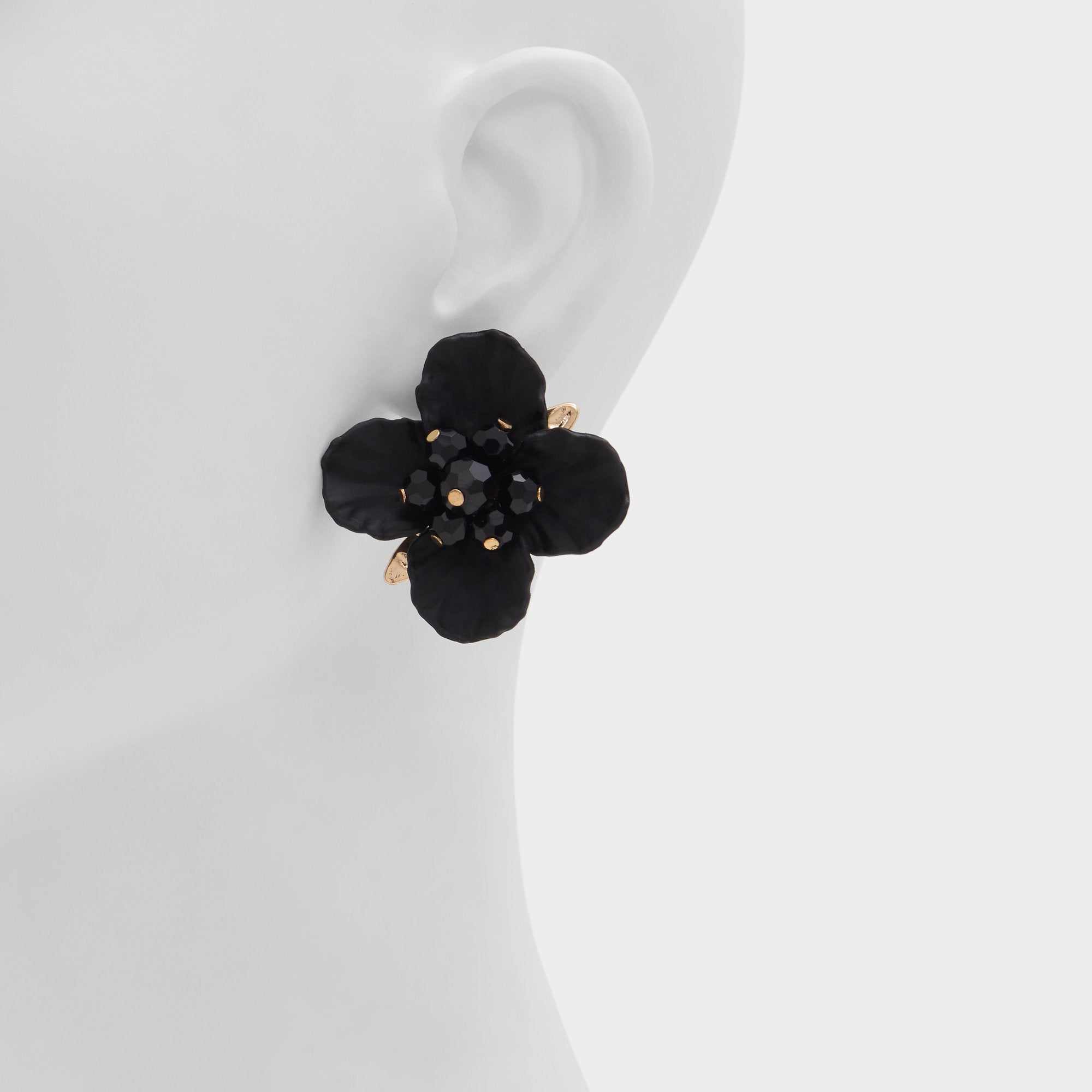 Sculpted petals in midnight acrylic bloom against gold posts, their faceted bead centers catching dance-floor light to turn these studs into corsages. Frame a sleek slip dress at rooftop cocktails or stack them with layered chains and a denim jacket on casual coffee runs.