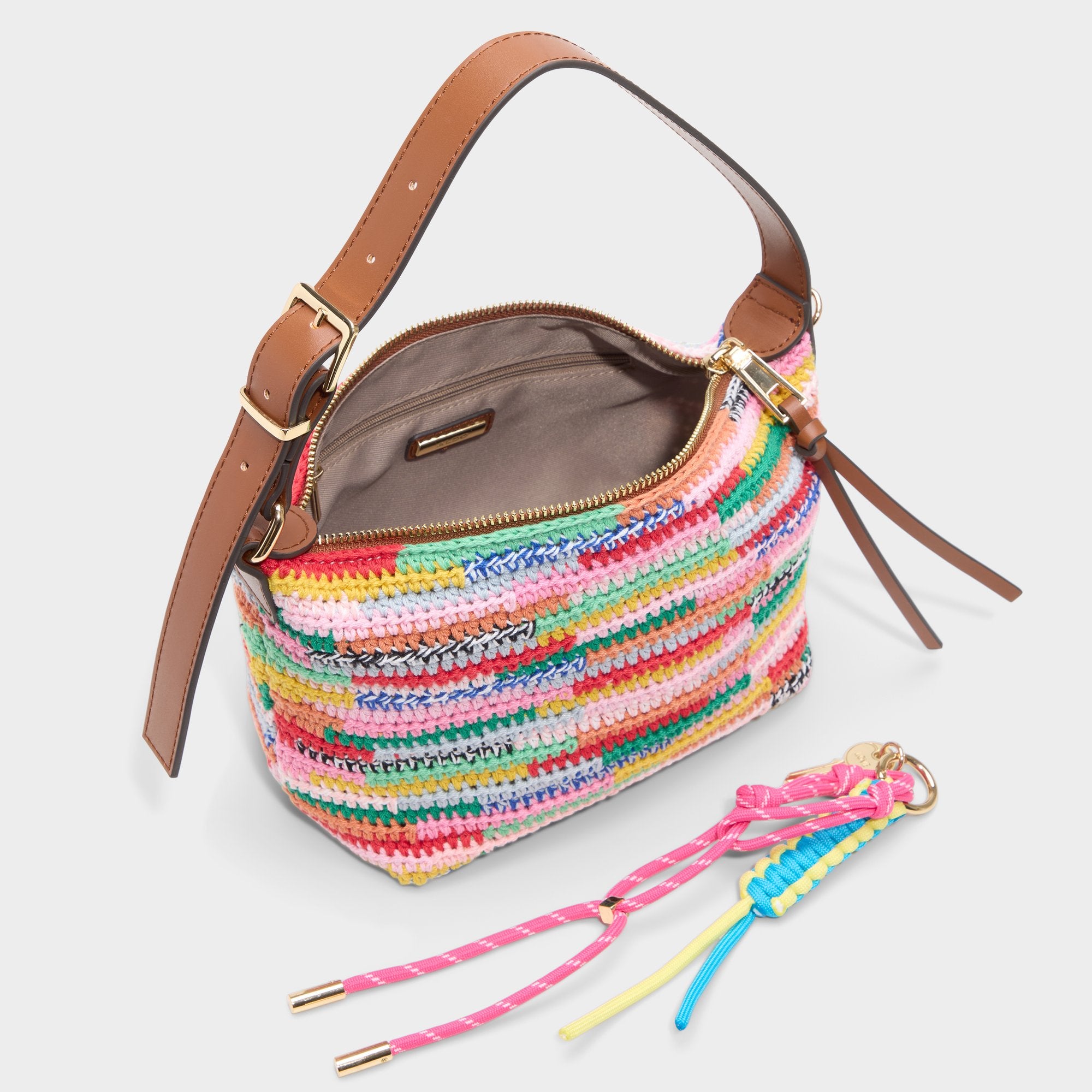 Crocheted rainbow stripes illuminate this mini hobo bag, turning beach-bar spirit into a wearable mood, with gold hardware and a braided tassel charm adding playful polish. Carry it with a breezy sundress to morning markets or sling it over cutoff shorts for sunset concerts, finishing looks with carefree ease.