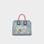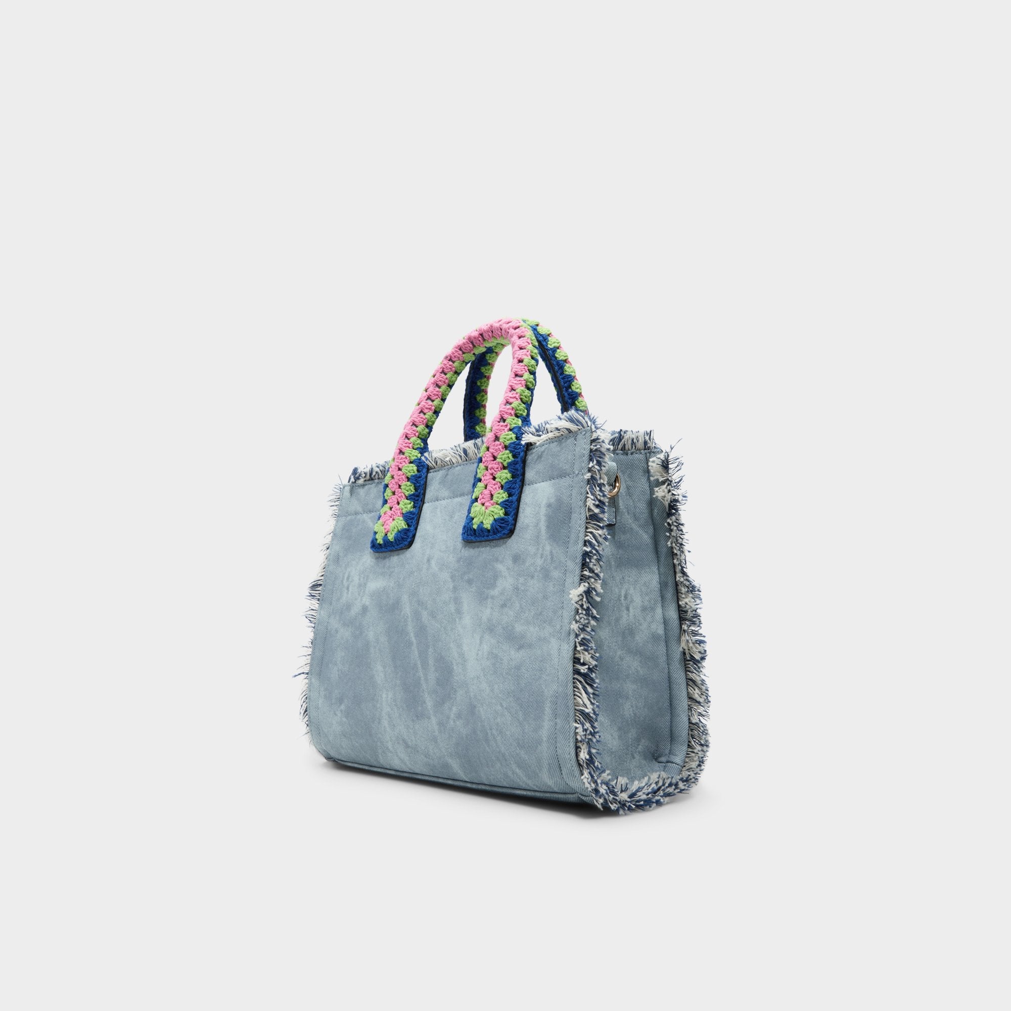 Denim fringe and sun-washed patches give this roomy tote a wander-ready edge, while candy-bright crochet handles bring a playful pop and a hands-free charm that shifts from everyday errands to seaside escapes. Pair with a linen set for market mornings or sling over cut-offs and a tank for weekend concerts, finishing th