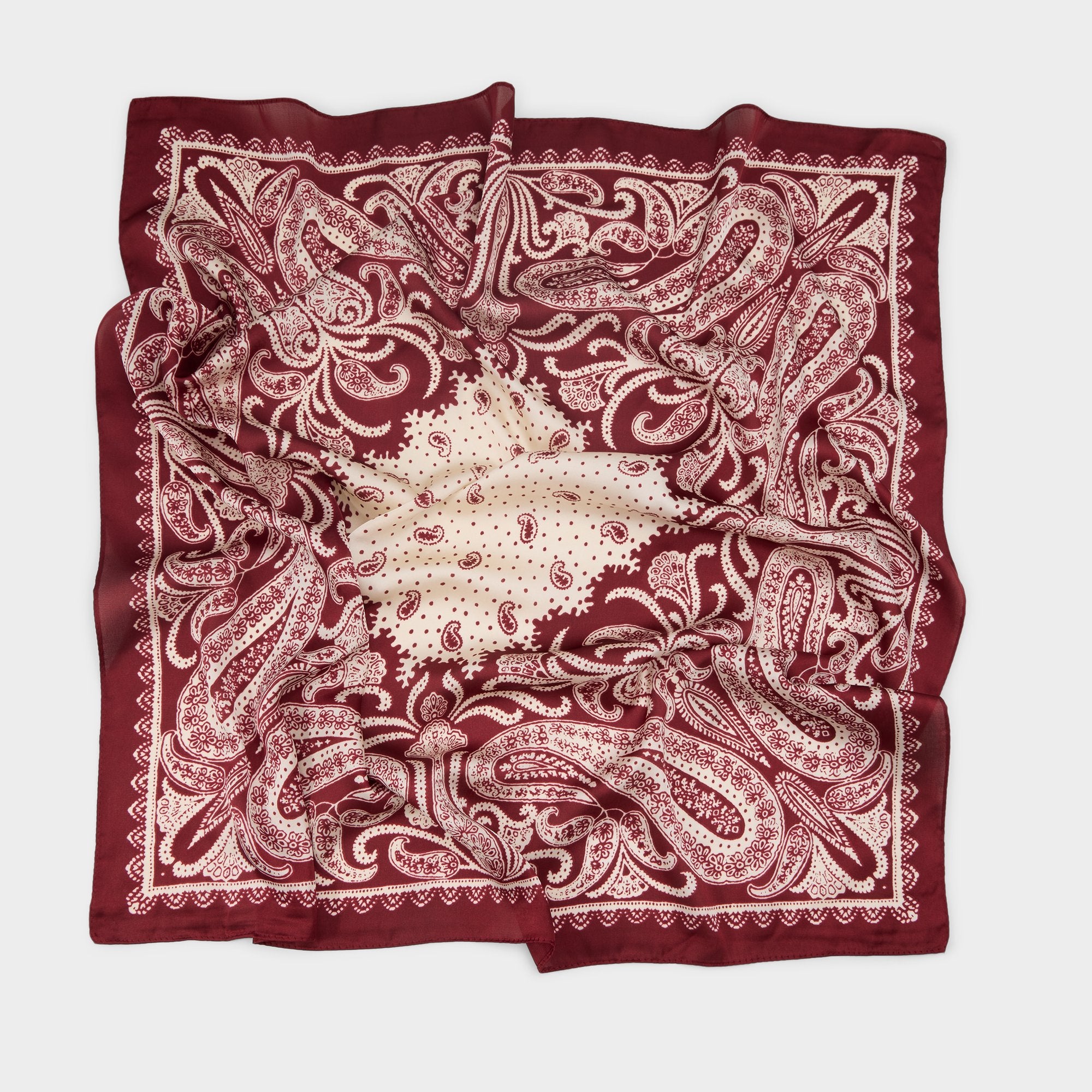 Paisley swirls flow over glossy silk, with the square cut folding gently wherever it's knotted, bringing vintage-road-trip vibes and lightweight polish in one small accessory. Pair it with a white tee and jeans for campus runs, or tie it on a handbag handle for beach weekends, adding an edgy touch.