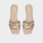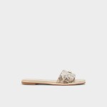 Snakeskin-patterned bands wrap the slide in untamed polish, their subtle gold gleam catching the city light, while flexible flat soles keep every step easy from sidewalk chatter to brunch lines. Pair with linen cropped pants for markets, or slip them under a satin midi when patio cocktails turn into starlit strolls.