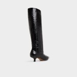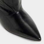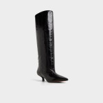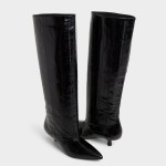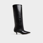 Midnight-gloss leather climbs to the knee in a clean column, while a poised kitten heel and pointy toe give subtle power that moves smoothly from sidewalk strut to late-show lounge. Ground a sweater-dress for crisp office mornings, or pair with leather shorts when rooftop cocktails trade daylight for city sparkle.