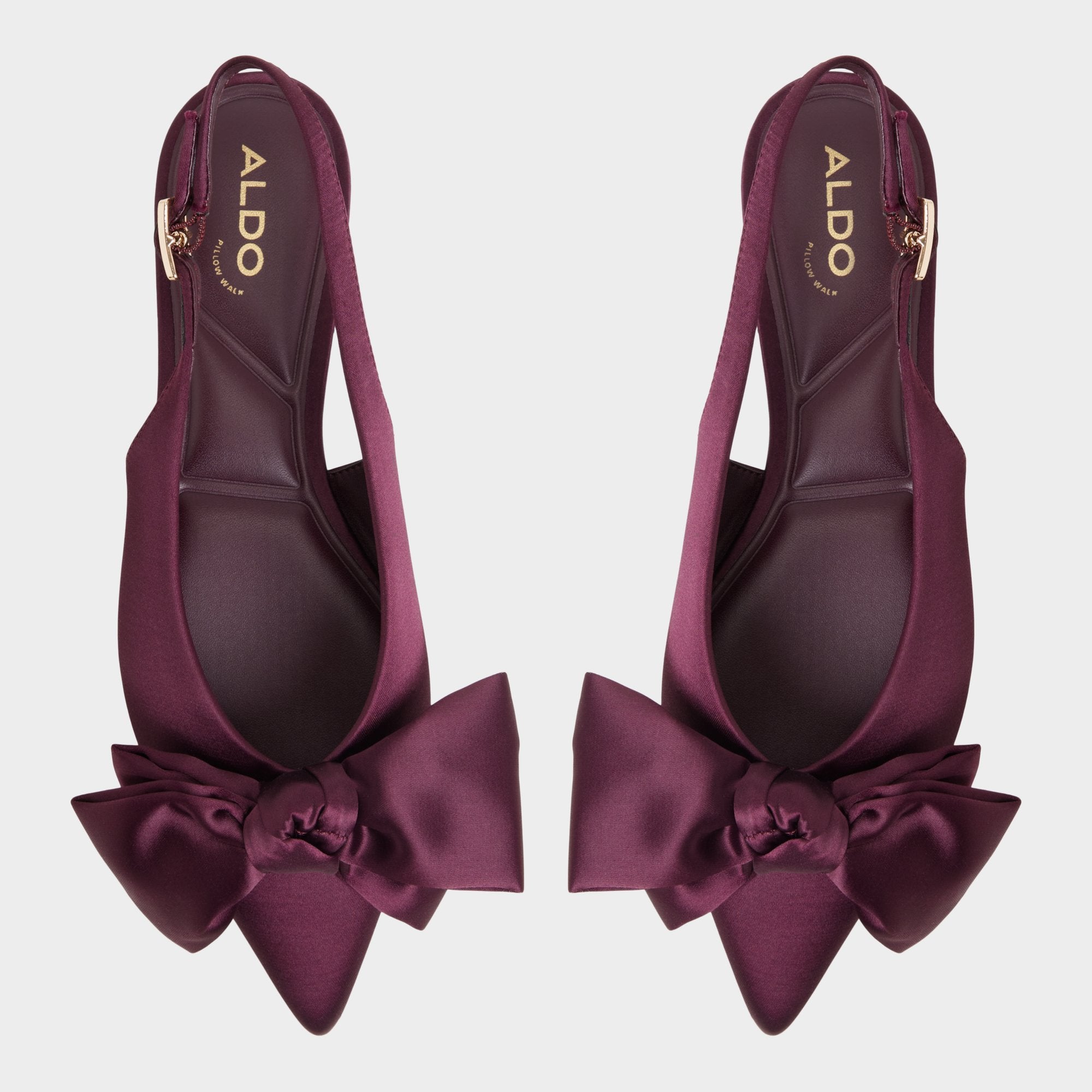 Festive-red satin glows across a point-toe slingback, where a sculpted bow crowns the vamp and a leather footbed keeps your stride sleek through gallery openings and late-night strolls. Pair with tux trousers for cocktail hours, or slip beneath a dress for holiday dinners and festive evenings.