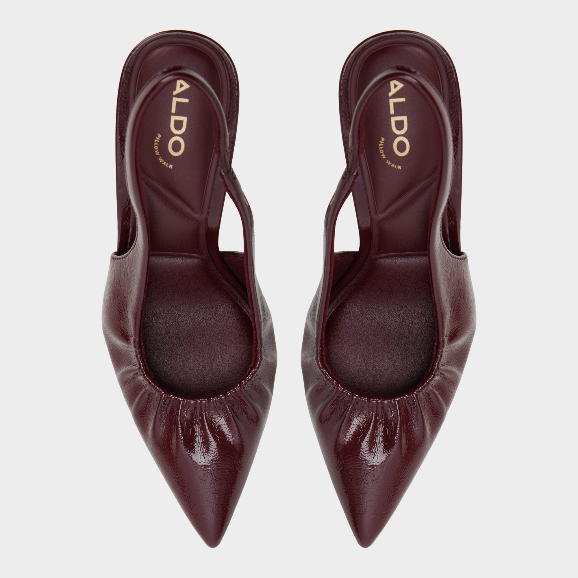 Glossy deep-red patent leather carves a sleek slingback silhouette, with a ruched vamp and a sky-bound heel that lengthens every stride, delivering confident polish from morning meetings to after-work surprises. Pair cropped suiting for presentation mornings, or anchor a slip dress for rooftop drinks that melt into can