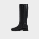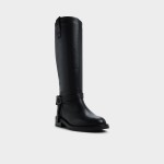 Supple black leather rises knee-high in a clean riding silhouette, with a harness-style buckle strap and a low block heel that lend subtle edge and all-day steadiness for city strolls, commutes, and evenings out. Pair with slim jeans for coffee-to-commute, or slip into a knit midi as museum afternoons melt into rooftop