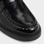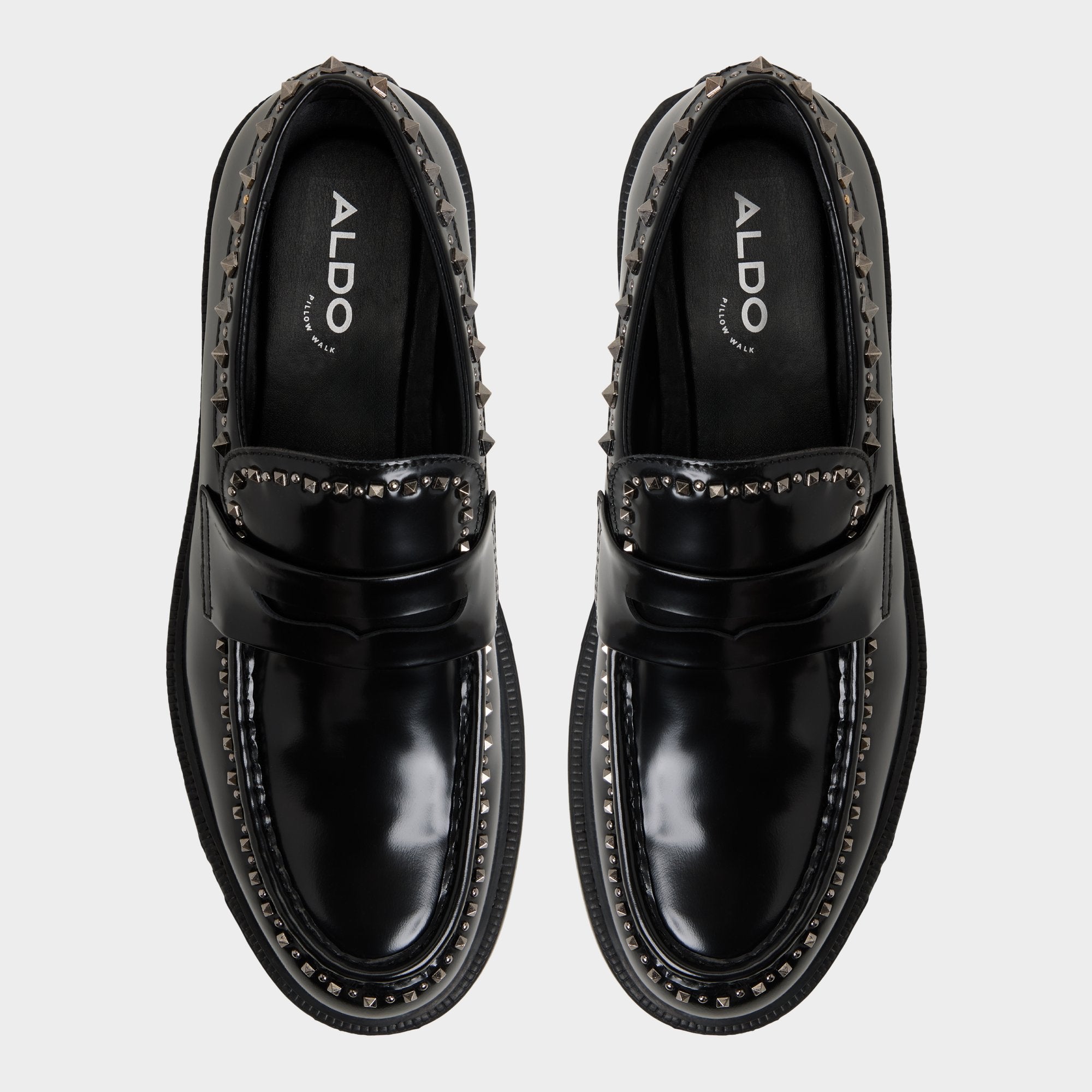 Patent leather gleams with matte studs across the loafer's silhouette, giving a rebellious edge, while the lug sole anchors each stride on city streets and beyond. Pair it with slim black denim for gallery nights or cropped trousers for after-work drinks, as the studded detail makes the look.